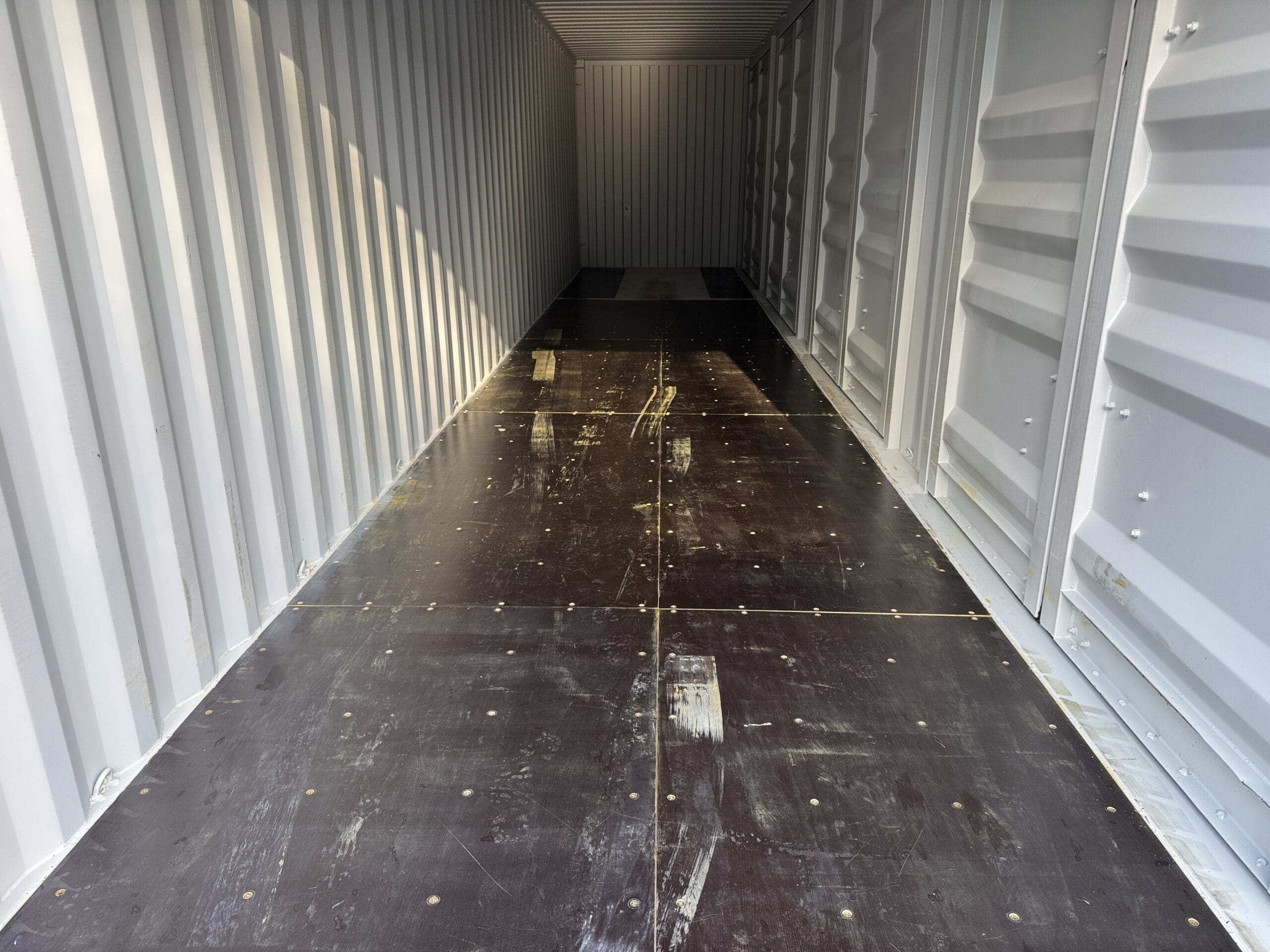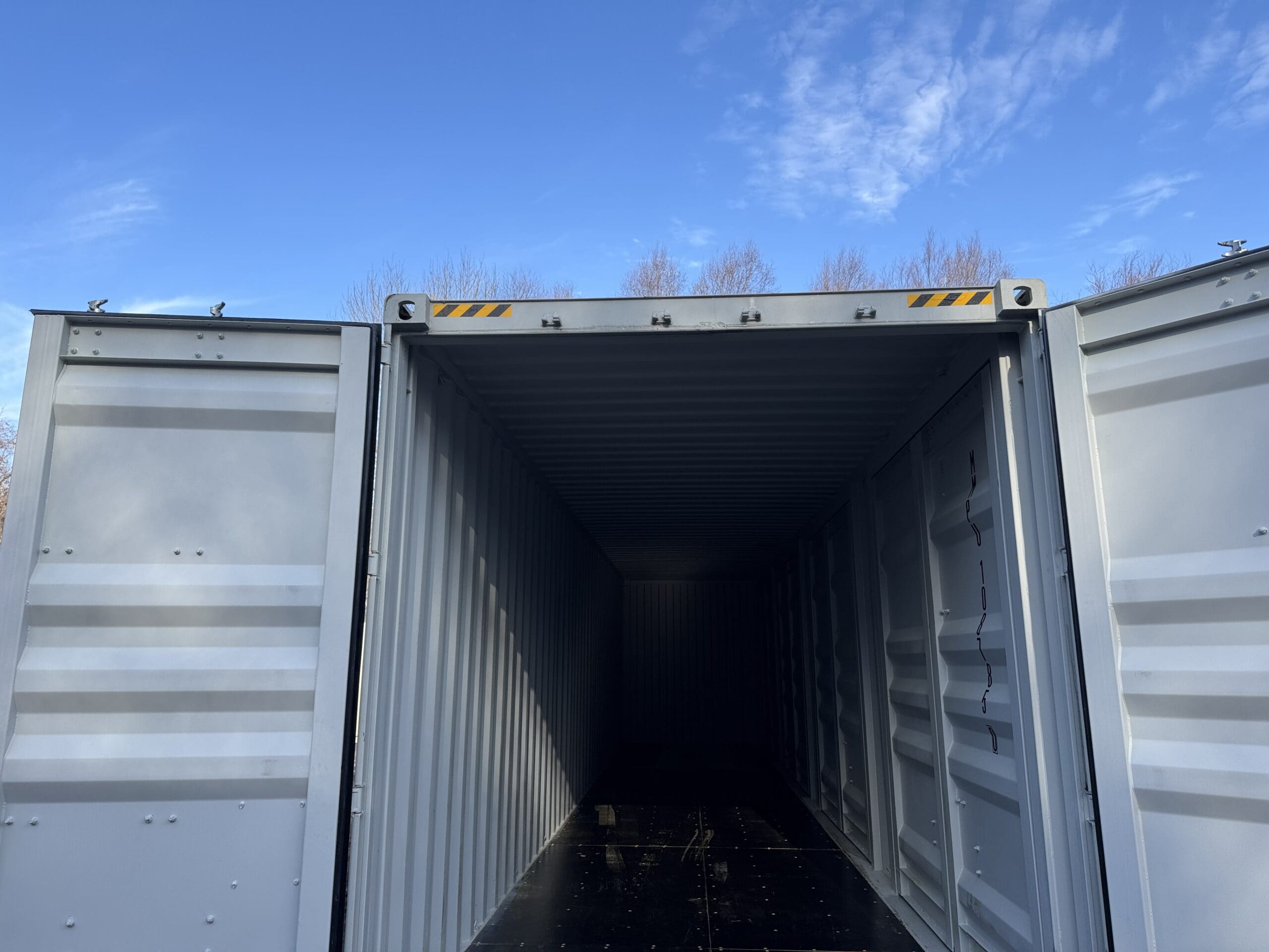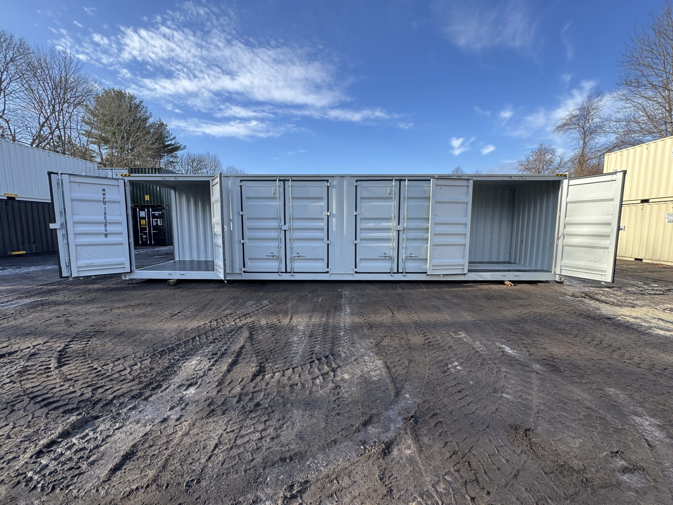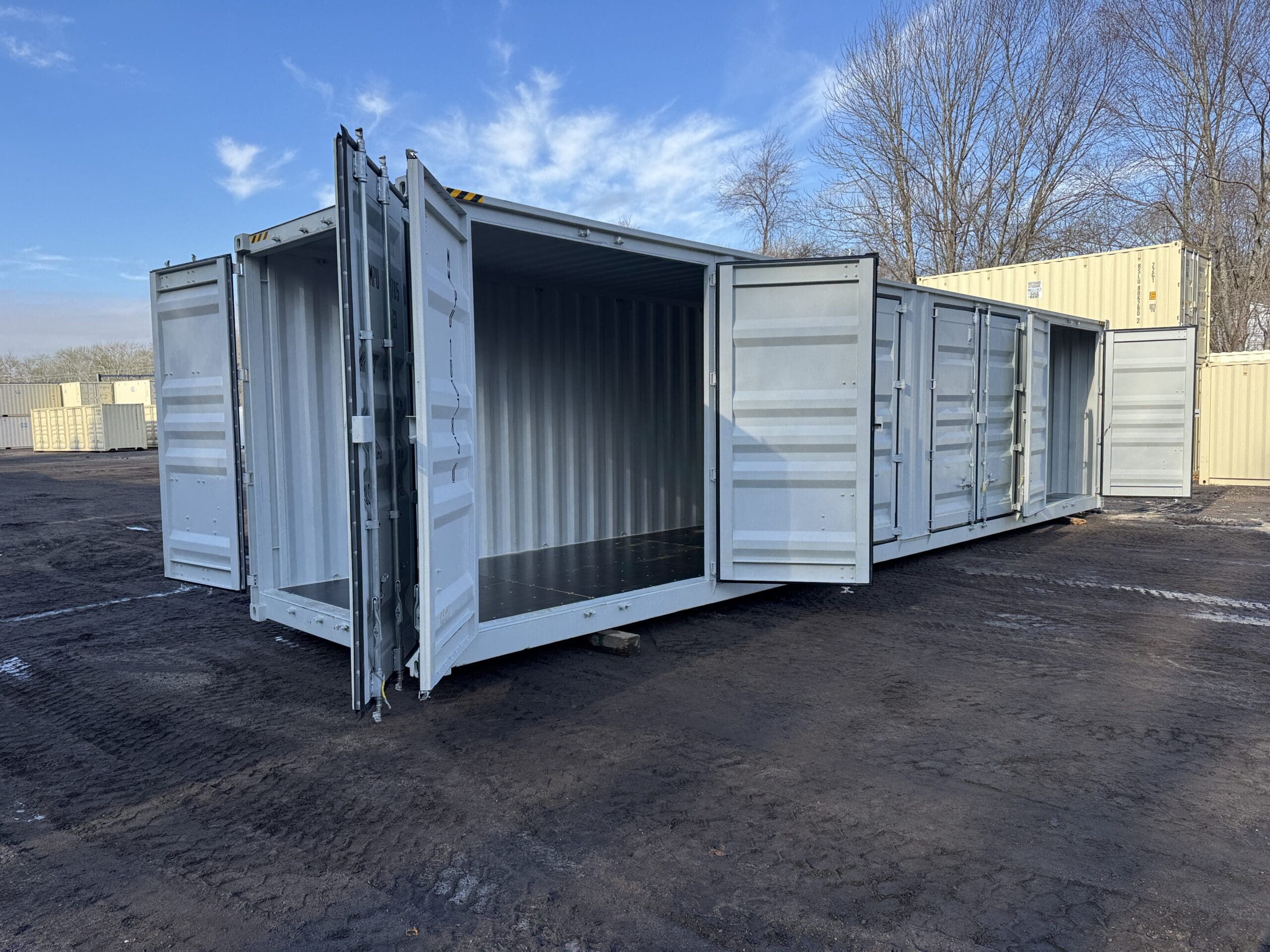 40′ x 8′ x 9.5′ Tall -New *High Cube**FOUR SIDE DOOR OPENINGS** Shipping/Storage Container – Wind and Watertight – LT GRAY